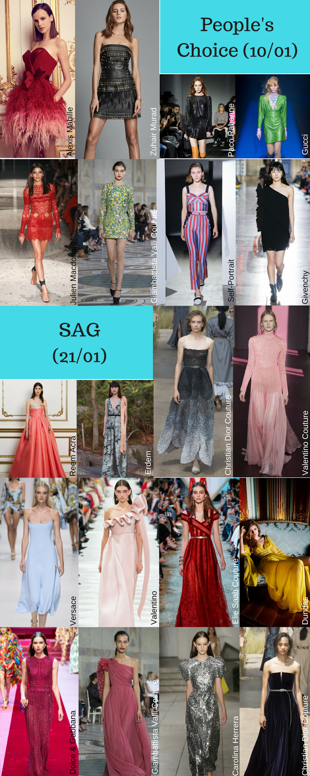 The People’s Choice Awards will be the second one this year, happening on January 10. From what I observed over the years, the attendees have freedom to wear what they want on the event, long or short dresses, pantsuits… Because this is one of the few that allows women to wear less formal outfits, on this section was included just this type of look, it breaks a little bit the pattern from all the other award show. Two of my favorite looks chosen are the Alexis Mabille dress (top left) and the Self-Portrait set.
