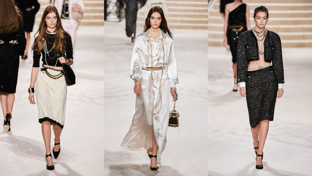 Pearls and chains are two of the most popular Chanel symbols. To pay homage to these two favorites from Coco, the models were multiple belts and necklaces made out of them.