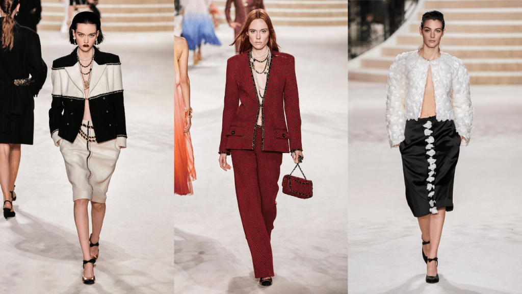 Virginie Viard views the Chanel girls as being (age apart) young, modern and sexy. So of course, they needed to add the sexiest and most modern styling to their show: wearing a blazer with no top underneath.