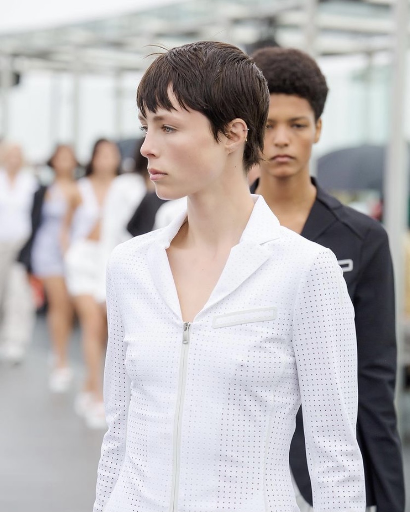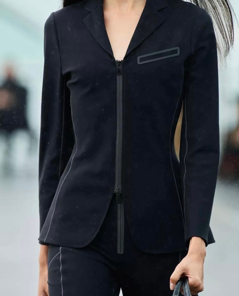 The tight dresses and aerodynamic jackets were created in a new jersey, which is dipped in a solution that makes it antibacterial, anti-UV and wrinkle resistant. Basically, the only way this fabric could be more perfect was if it became a hazmat suit anytime someone sneezes (or coughs).