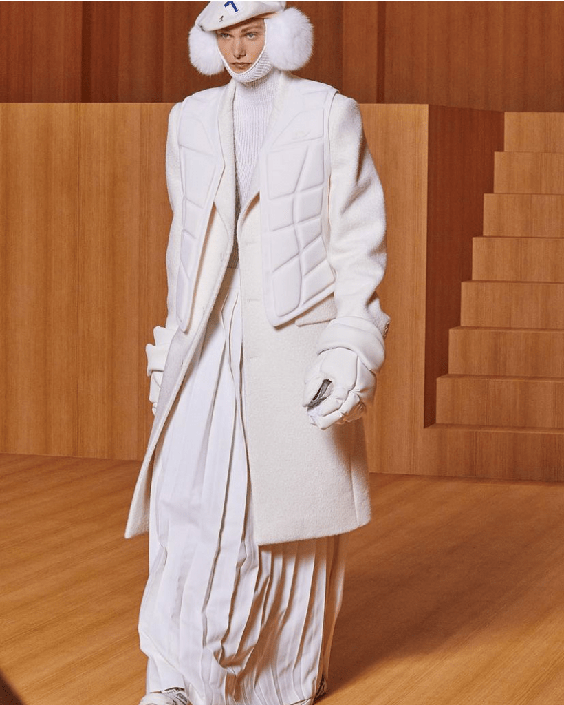 Louis Vuitton released a short film, directed by Mahfuz Sultan, that was as interesting as the clothes. A group of gray suits fights with the other characters in battles and clothes that resembles chess and kendo. The creative director used long skirts, furry headphone headgear, and tall hats to reference chess pieces like pawns, knights and the queen. The skirts are also part of the kendo uniform, which also inspired the padded vests and armor-plated puffers.